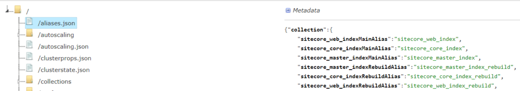 In the screenshot below if we look at sitecore_web_indexMainAlias, the index being used could be sitecore_web_index or sitecore_web_index_rebuild depending which index is being rebuilt. Once rebuilt, they swap. If I ran a Solr indexing operation on this index from the Sitecore CMS, the sitecore_web_indexMainAlias would point/have sitecore_web_index_rebuild after the colon once the rebuild is complete.